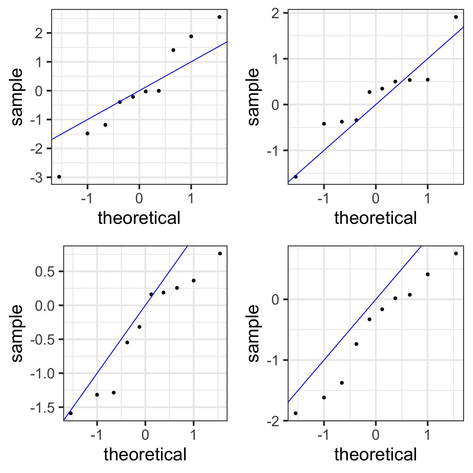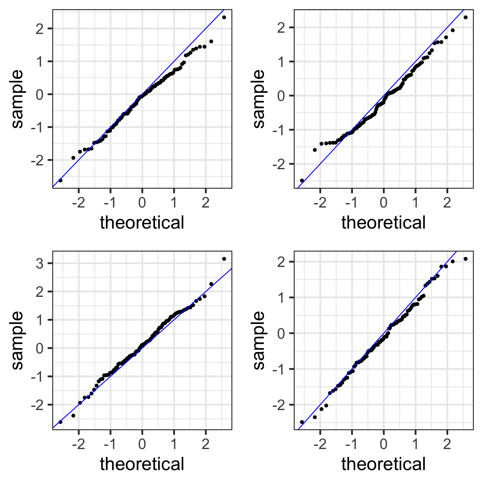 Thus, all the points in the QQ plots should theoretically fall in a line