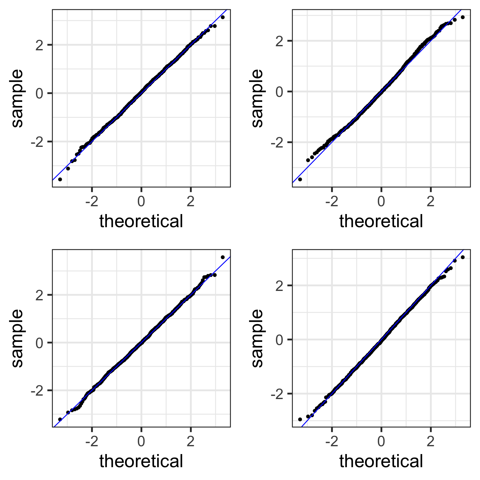 stat_qq_line() doesn’t work with randomly generated samples, and thus the code below manually creates the line that the points should be on (which is \(y=x\) in this case.)samplesize <- 100