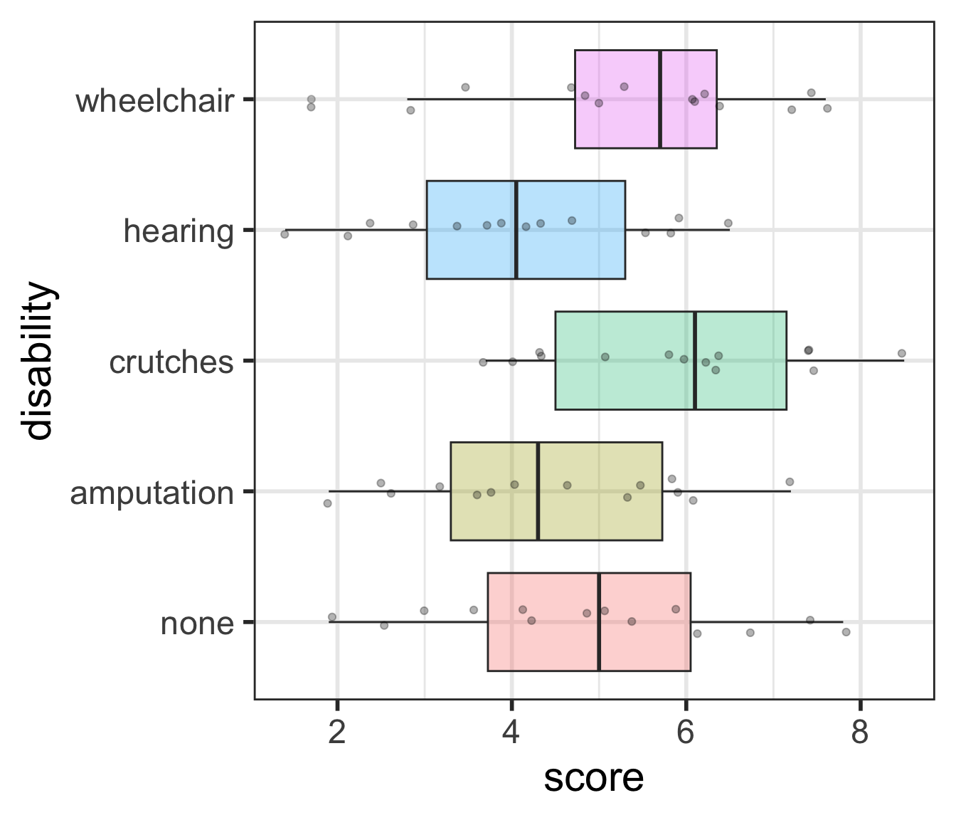 \[\begin{align} H_0 &: \mu_{none} = \mu_{amputation} = \mu_{crutches} = \mu_{hearing} = \mu_{wheelchair}\\ \text{vs. } H_A&: \text{At least one pair } \mu_i \neq \mu_j \text{ for } i \neq j \end{align}\]