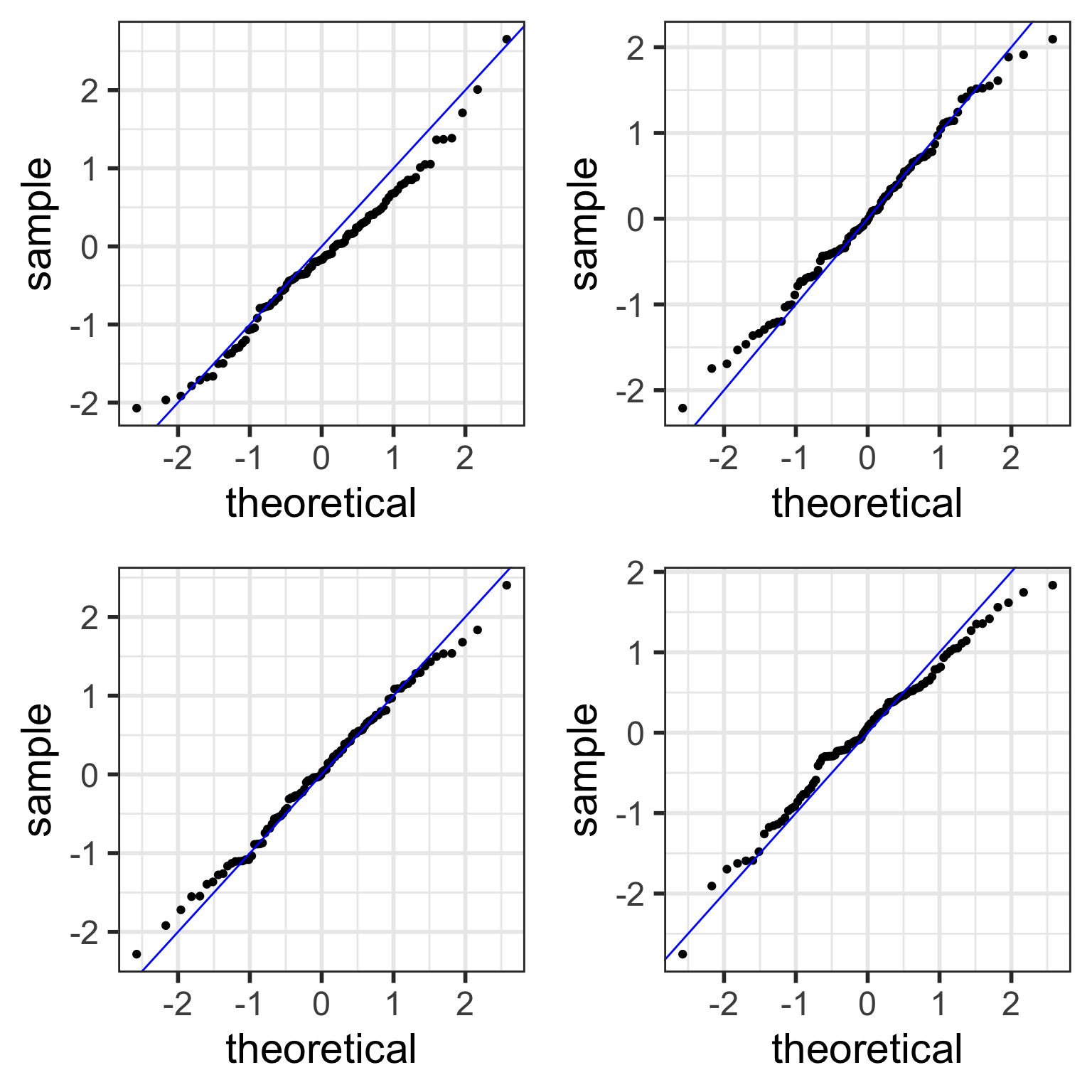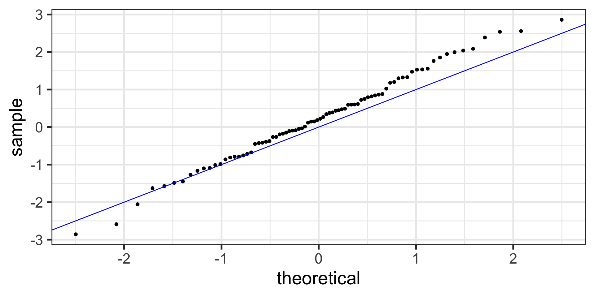 stat_qq_line() doesn’t work with randomly generated samples, and thus the code below manually creates the line that the points should be on (which is \(y=x\) in this case.)samplesize <- 100
