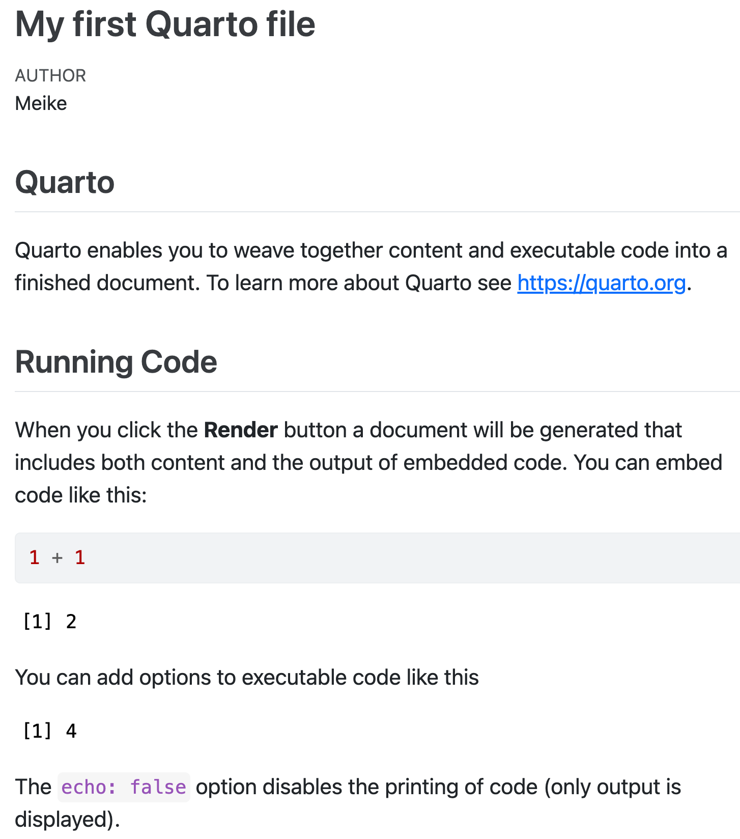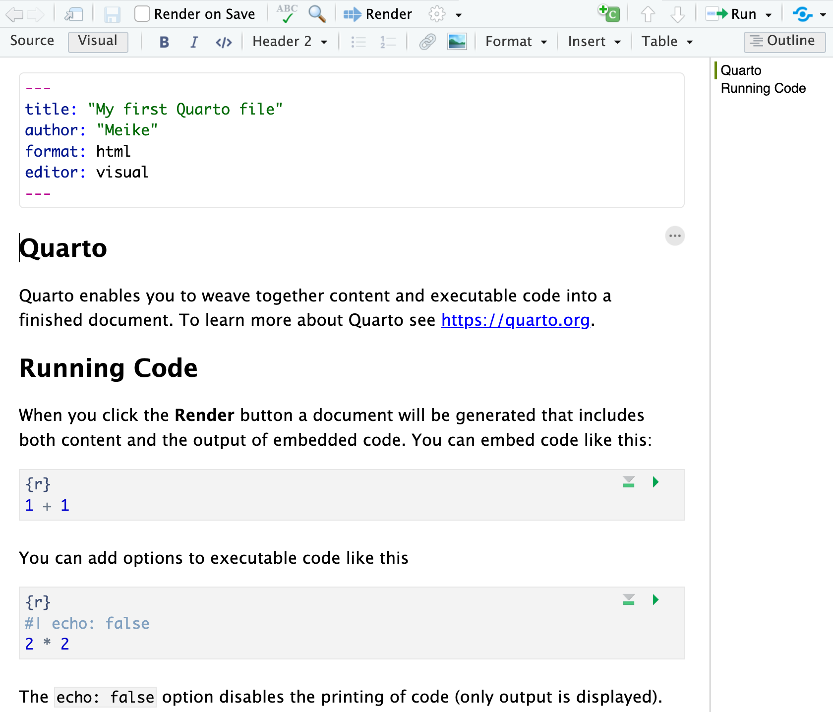 .qmd)Create, you should then see the following in your editor window:.qmd)File -> Save,We create the html file by rendering the .qmd file.