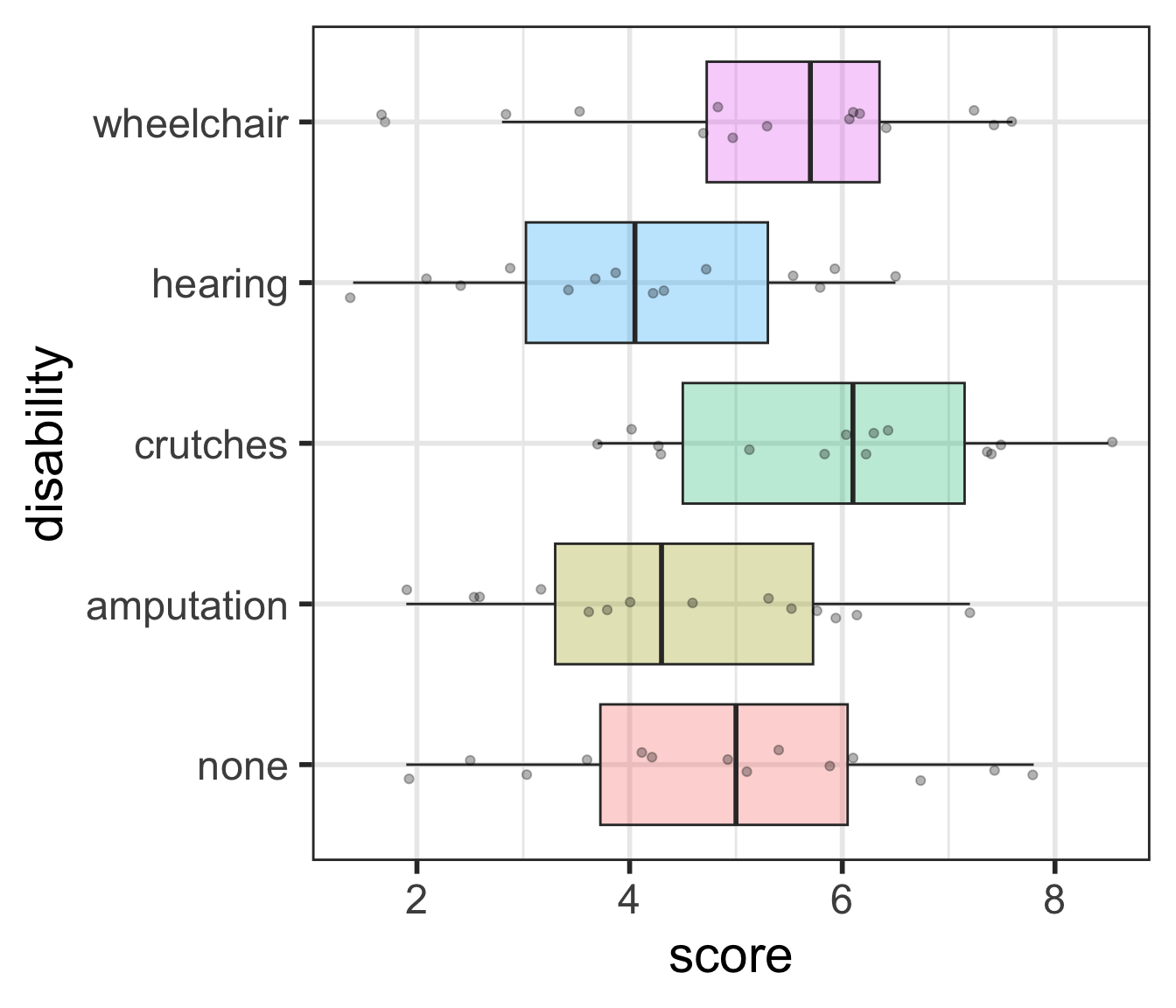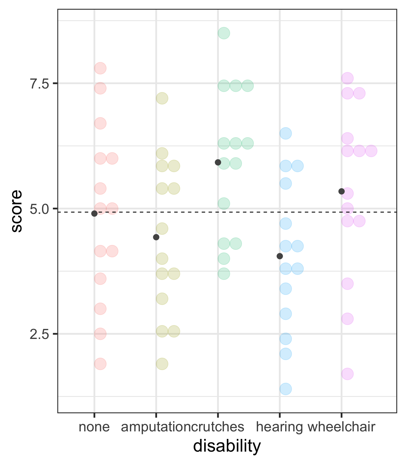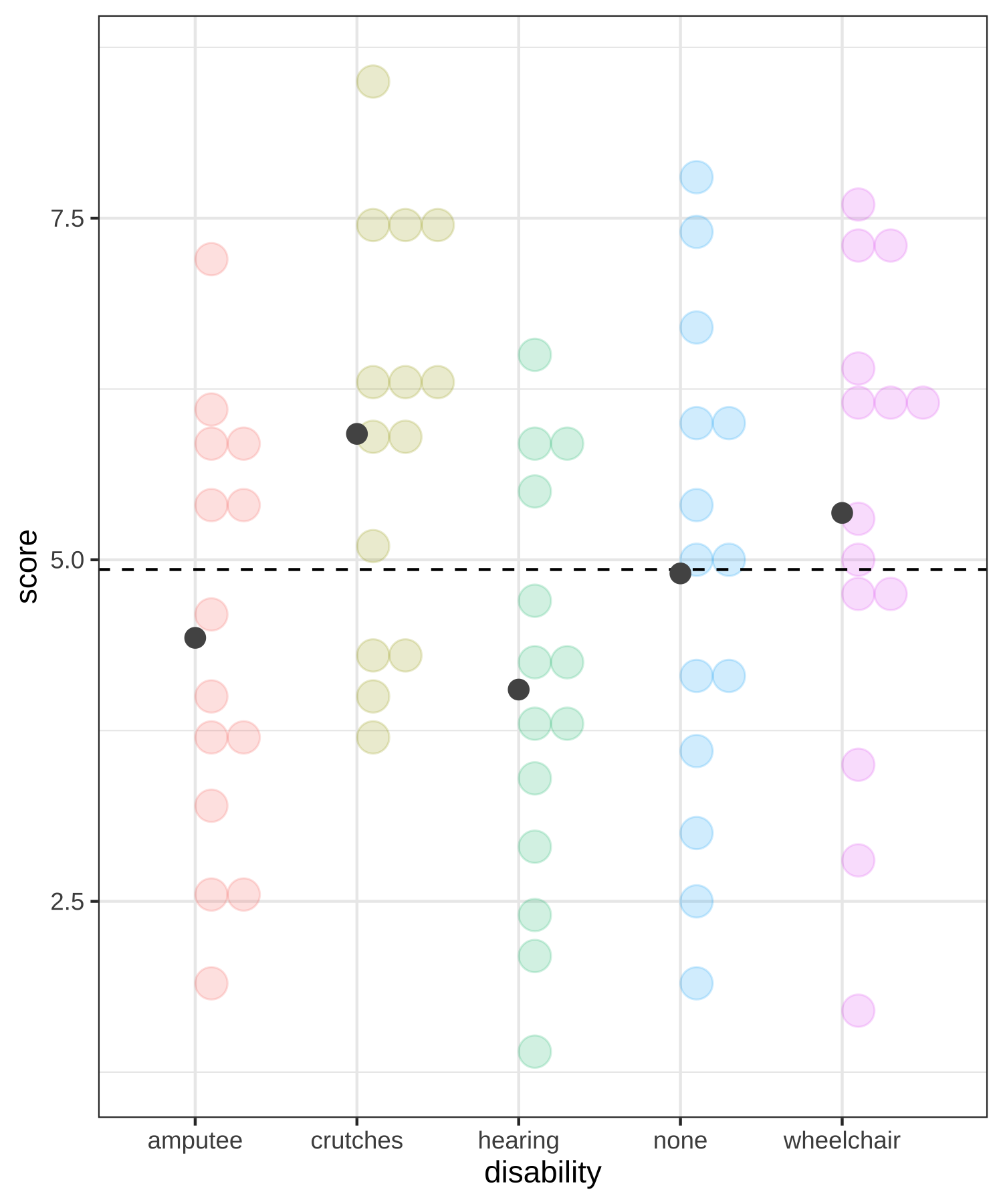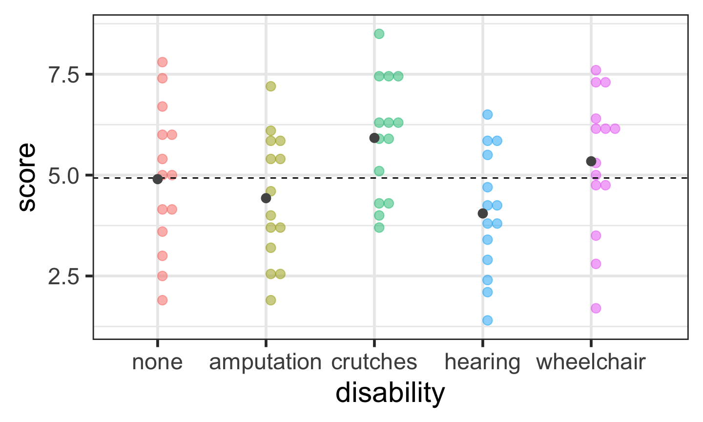\[\begin{align} H_0 &: \mu_{none} = \mu_{amputation} = \mu_{crutches} = \mu_{hearing} = \mu_{wheelchair}\\ \text{vs. } H_A&: \text{At least one pair } \mu_i \neq \mu_j \text{ for } i \neq j \end{align}\]