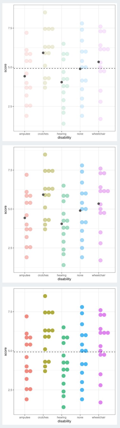 Fit: aov(formula = score ~ disability, data = employ)