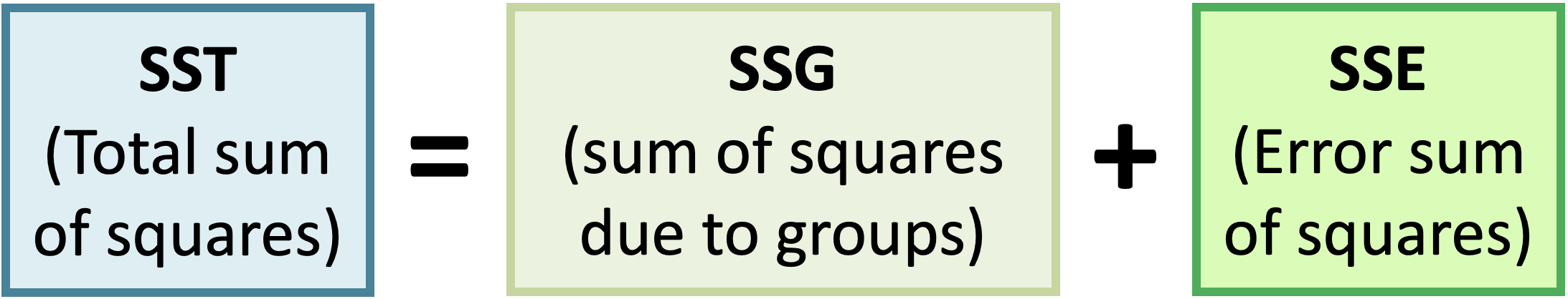 \[SSE = \sum_{i = 1}^k\sum_{j = 1}^{n_i}(x_{ij}-\bar{x}_{i})^2 = \sum_{i = 1}^k(n_i-1)s_{i}^2\] where \(s_{i}\) is the standard deviation of the \(i^{th}\) group
