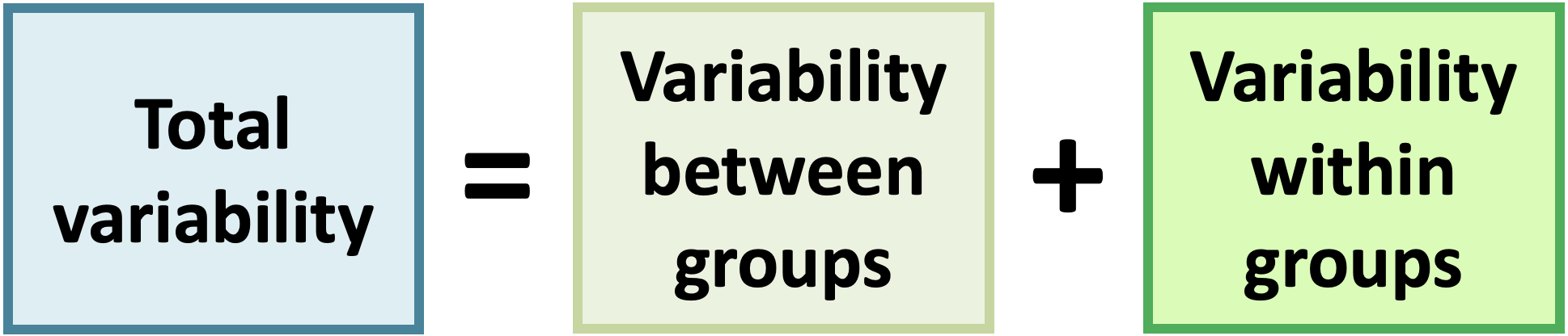 \[\sum_{i = 1}^k \sum_{j = 1}^{n_i}(x_{ij} -\bar{x})^2 \ \ = \ \ n_i\sum_{i = 1}^k(\bar{x}_{i}-\bar{x})^2 \ \ + \ \ \sum_{i = 1}^k\sum_{j = 1}^{n_i}(x_{ij}-\bar{x}_{i})^2\]