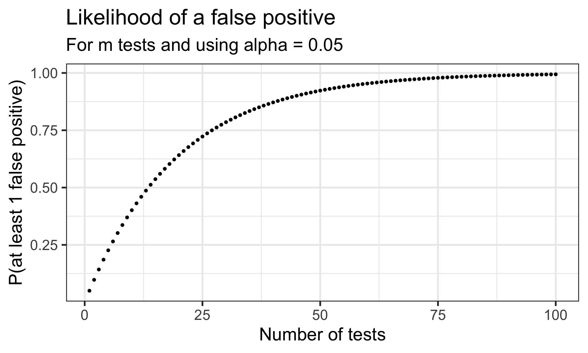 \[p\textrm{-value} < \alpha_{Bonf} = \frac{\alpha}{m}\] is the same as \[m \cdot (p\textrm{-value}) < \alpha\] The Bonferroni correction is popular since it’s very easy to implement.