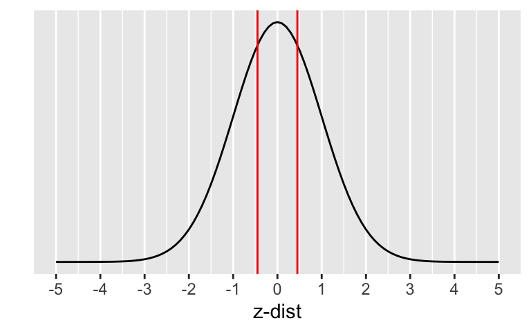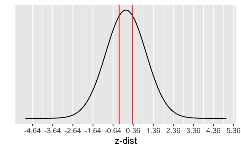 \[\begin{align} z_{\hat{p}} &= \frac{94/269 - 0.36}{\sqrt{\frac{0.36\cdot(1-0.36)}{269}}} \\ & -0.3607455 \end{align}\]