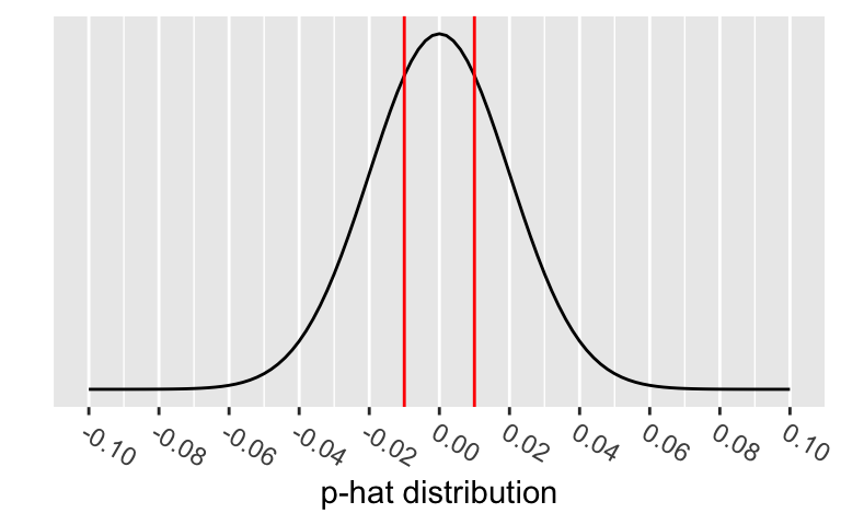 \[\hat{p} \sim N\Big(\mu_{\hat{p}} = p, \sigma_{\hat{p}} = \sqrt{\frac{p(1-p)}{n}} \Big) \sim N\Big( \mu_{\hat{p}}=p_0, \sigma_{\hat{p}}=\sqrt{\frac{p_0\cdot(1-p_0)}{n}} \Big)\]