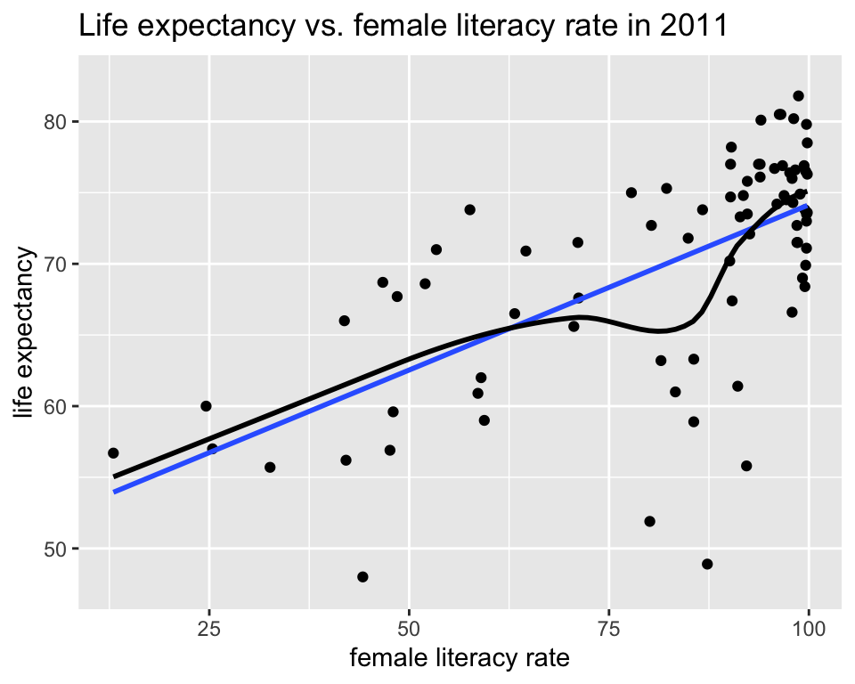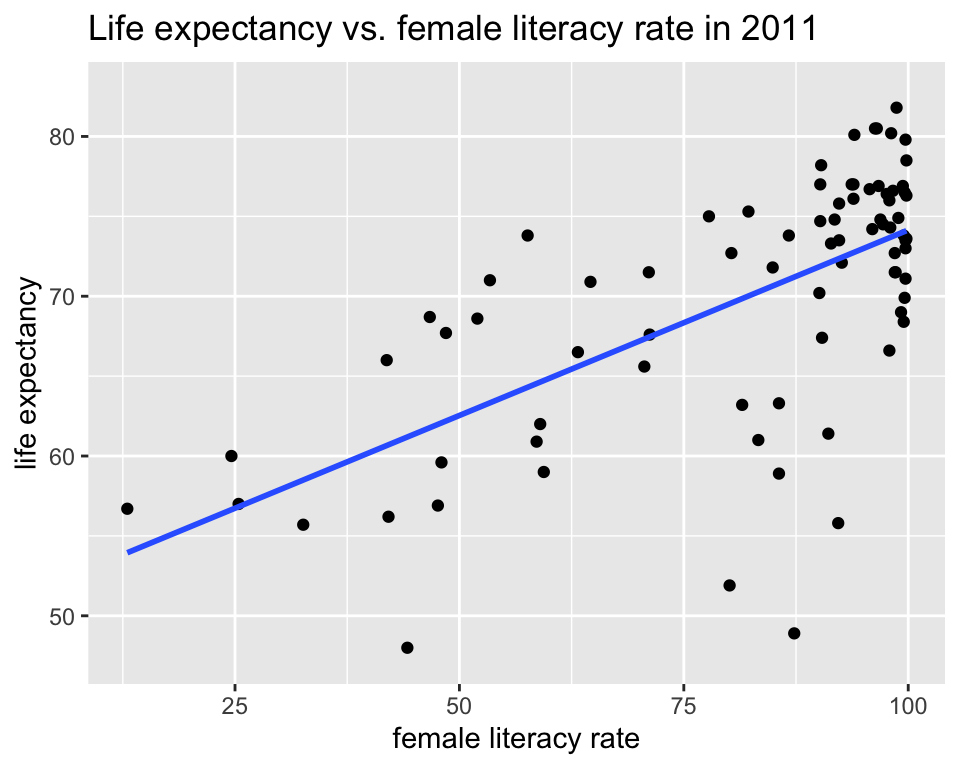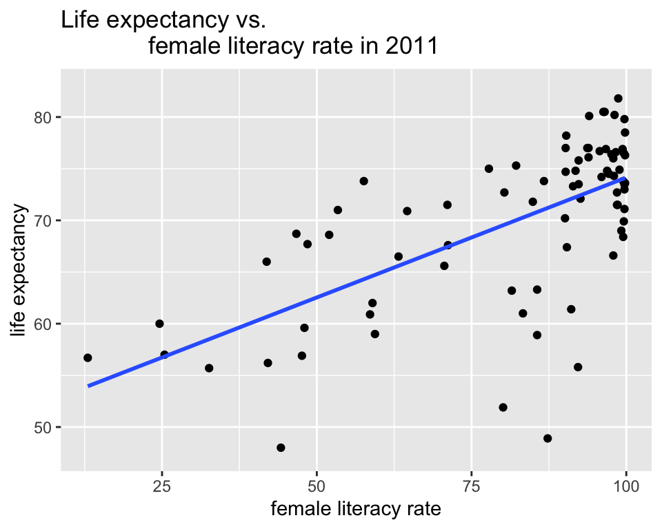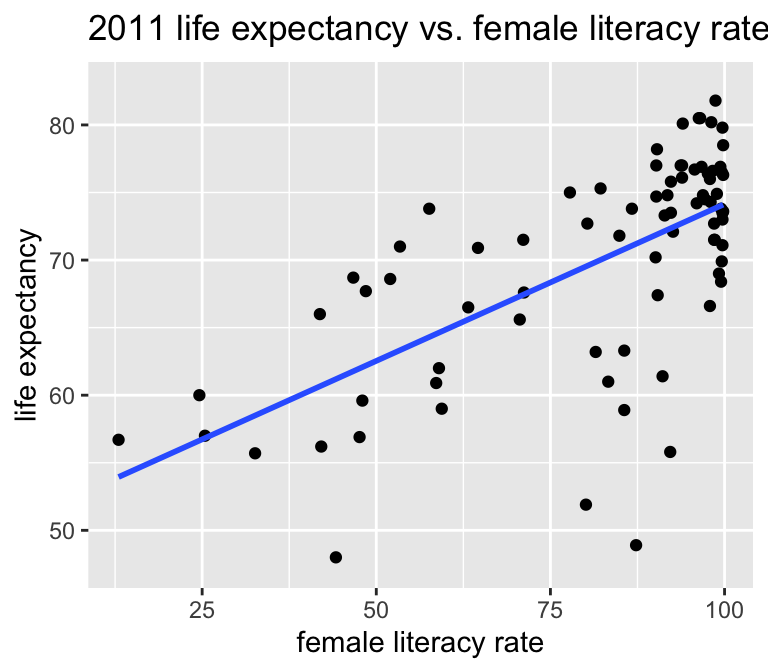 title = "Life expectancy vs. female literacy rate in 2011") +