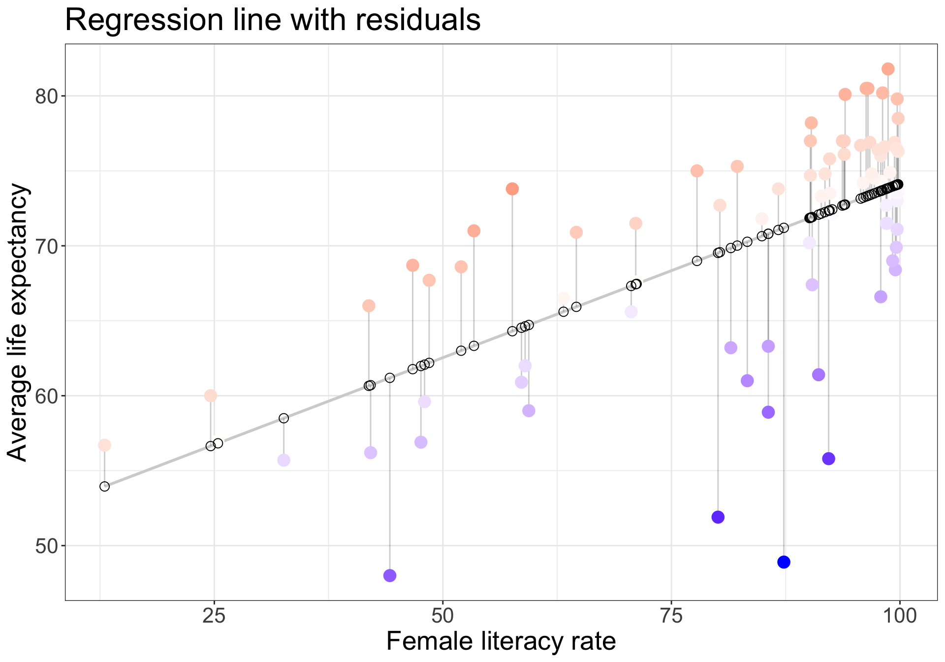 \[\widehat{\textrm{life expectancy}} = 50.9 + 0.232 \cdot \textrm{female literacy rate} \]