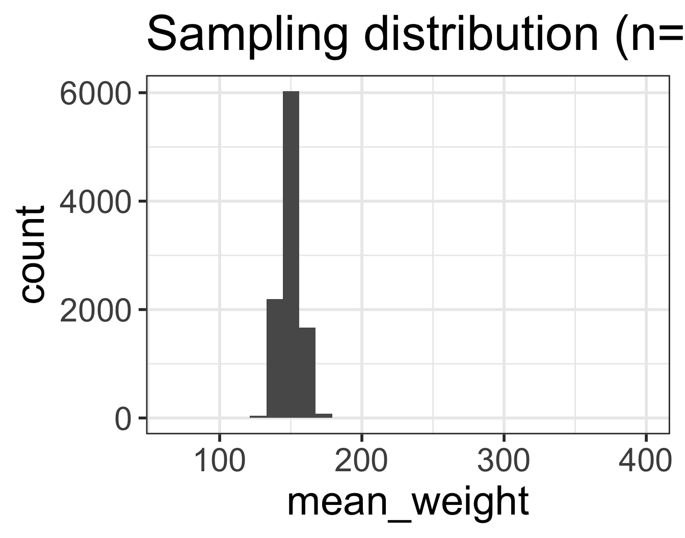 - Sampling distribution of mean weights when \(n=30\).