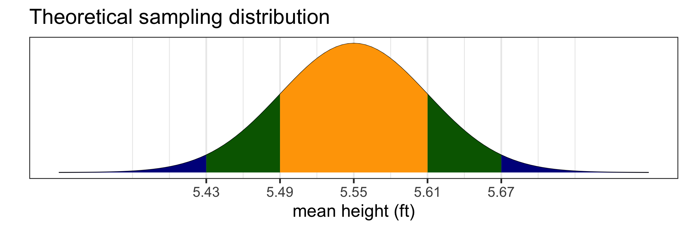 CLT tells us that we can model the sampling distribution of mean heights using a normal distribution.