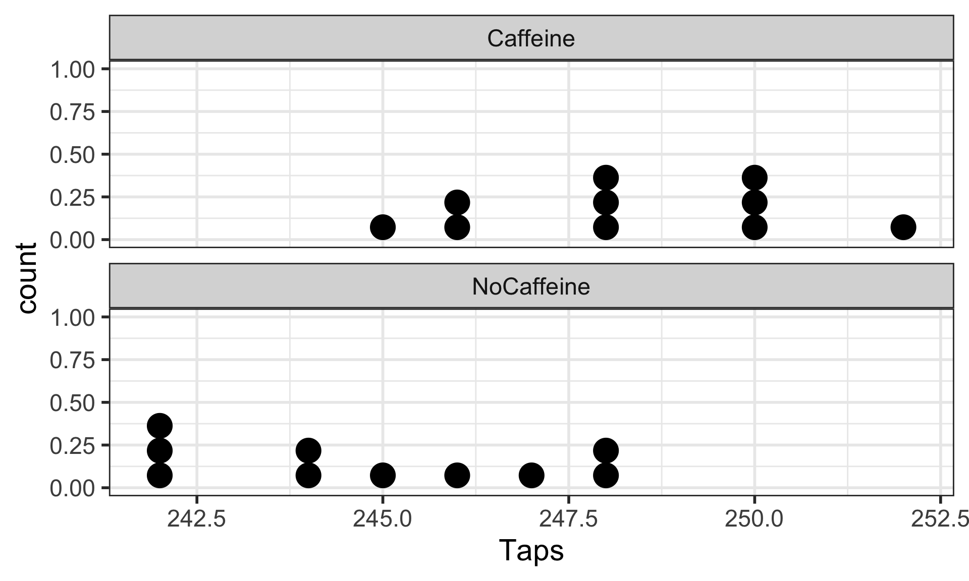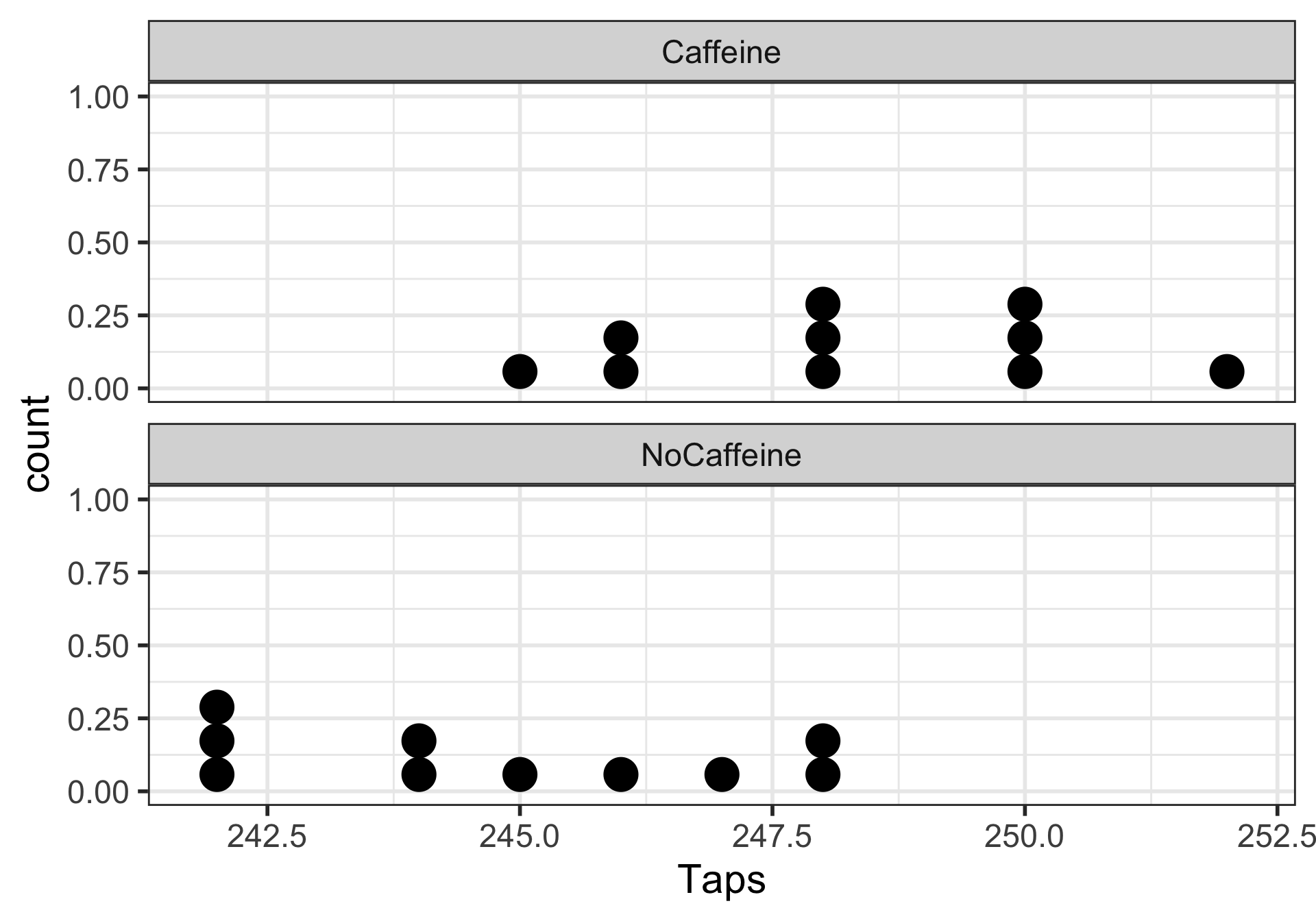 The mean finger taps/min were 244.8 (SD = 2.4) and 248.3 (SD = 2.2) for the control and caffeine groups, and the increase of 3.5 taps/min was statistically discrenible ( \(p\)-value = 0.004).