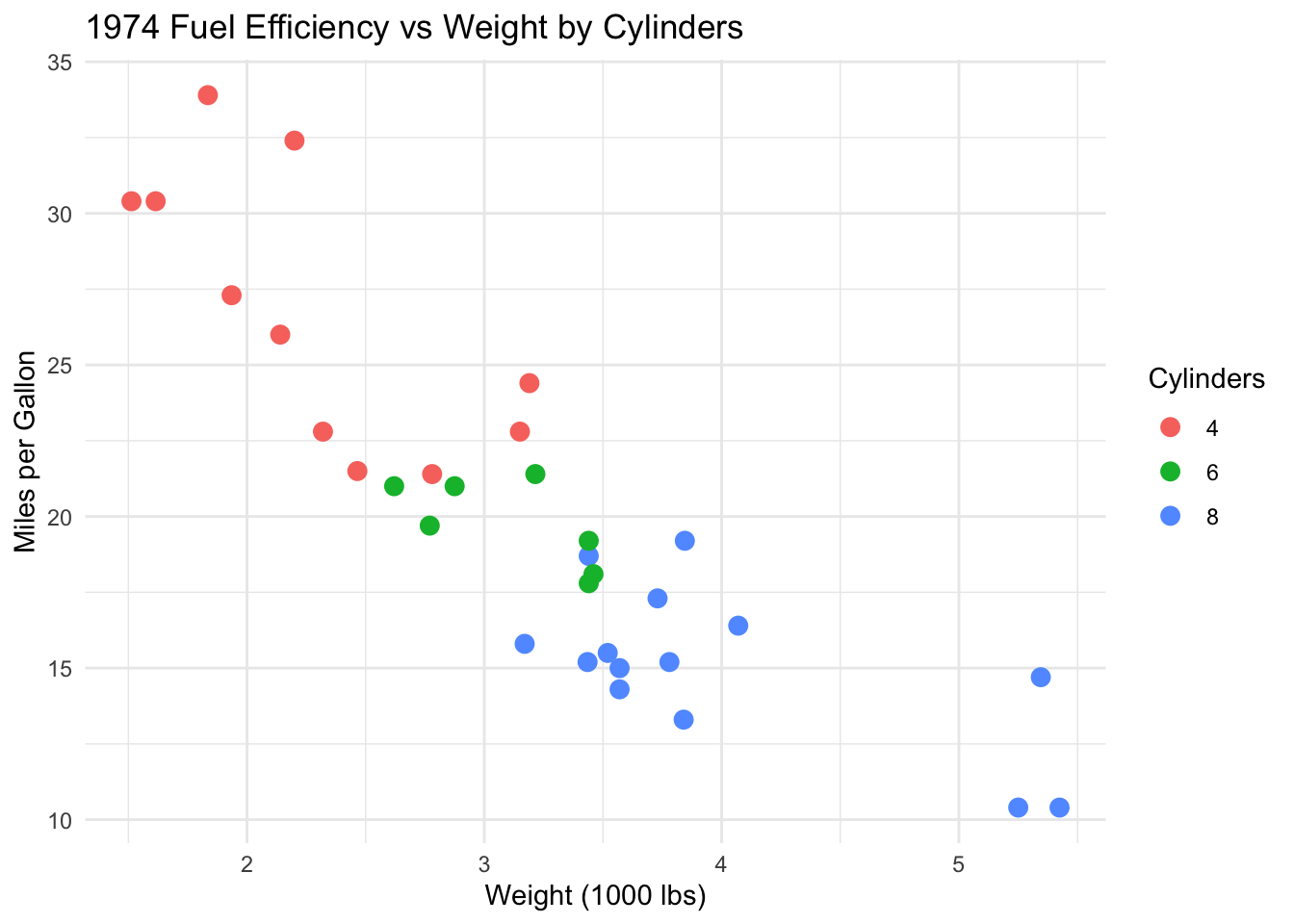 # Creating a scatterplot of fuel efficiency versus vehicle weightcarfig1 <-ggplot(mtcars_tbl,aes(x = wt, y = mpg, color = cyl)) +geom_point(size =3) +theme_minimal() +labs(title ="1974 Fuel Efficiency vs Weight by Cylinders",x ="Weight (1000 lbs)",y ="Miles per Gallon",color ="Cylinders" )# Showing the static ggplotcarfig1
