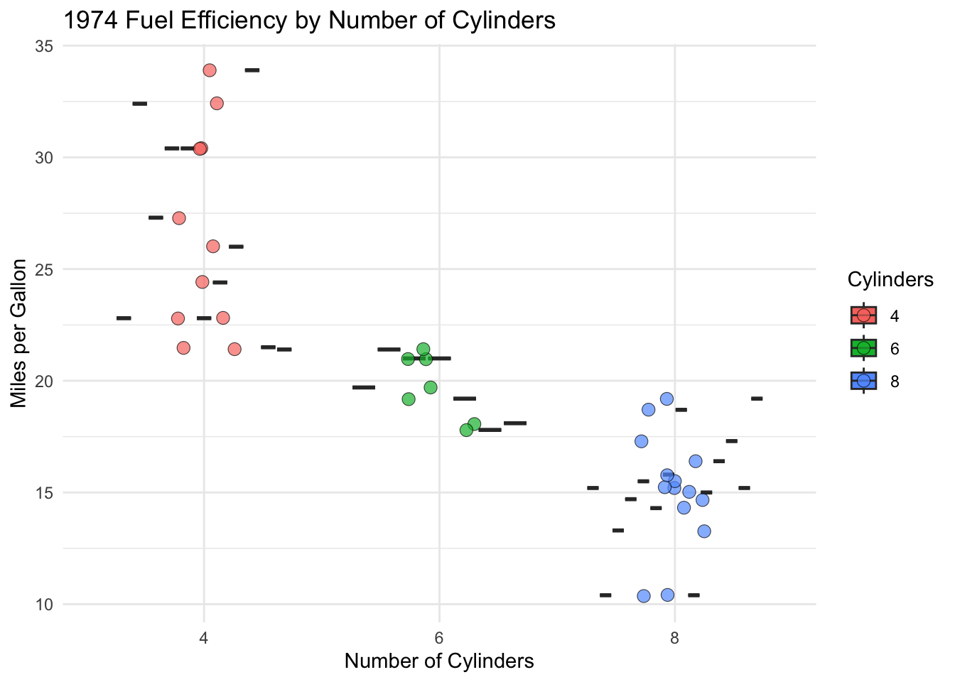 # Creating a boxplot comparing fuel efficiency by number of cylinders# Adding custom hover text for each carcarfig2 <-ggplot( mtcars_tbl,aes(x = cyl,y = mpg,fill = cyl,text =paste0( # Specifying exact hover text"Car: ", car,"<br>MPG: ", mpg,"<br>Weight: ", wt,"<br>Transmission: ", am ) )) +geom_boxplot() +geom_jitter(width =0.15, alpha =0.7, shape =21, size =3, stroke =0.3) +# Showing individual observationstheme_minimal() +labs(title ="1974 Fuel Efficiency by Number of Cylinders",x ="Number of Cylinders",y ="Miles per Gallon",fill ="Cylinders")# Showing the static boxplotcarfig2